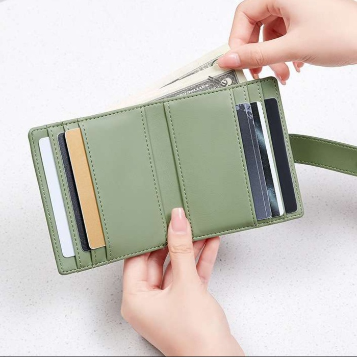 グリーンカテゴリに属する実用的な財布で、カード収納に便利なポケットを搭載。
